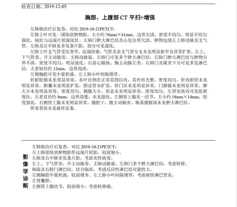 前几天给大家汇报了肿瘤标志物已恢复正常范围。昨天做了ctmr,刚看到结果,虽然主病灶有缩小,但好像右肺显示多发条片影,不知道是不是转移?请大家帮忙看看。再者胸水增多,淋巴结增多?哎,有点心塞。