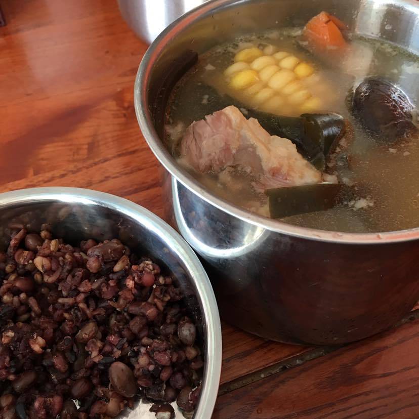 午餐带上做好的杂粮饭,共15种杂粮,拿着棒骨、海带、香菇、胡萝卜玉米到公司煲汤,热乎乎的,真好!一天的营养够了