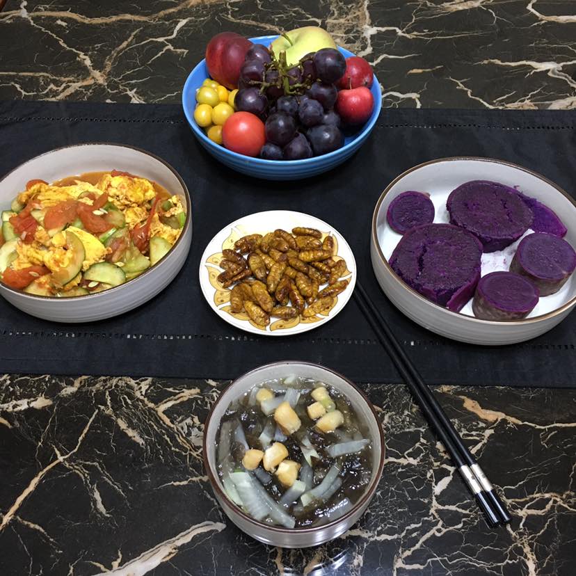 今天不休息,早晨在家做的早餐:黄瓜西红柿炒蛋/蚕蛹/紫薯/干贝萝卜紫菜汤/水果共14种食物