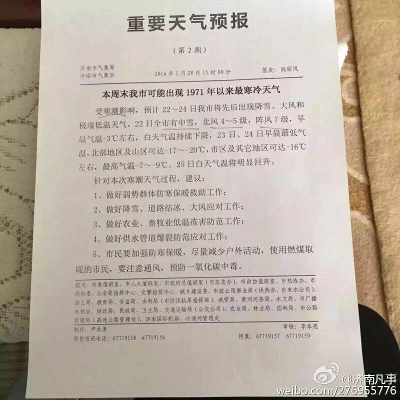 [cp]#济南生活# 【紧急扩散!1971年以来最冷天气来了 】22-24日,济南将出现降雪、大风和极端低温天气。22日有中雪,北风4-5级,阵风7级,早晨气温-3℃左右,白天气温持续下降,23日、24日早晨最低气温,北部地区及山区可达-17℃~-20℃,市区及其他地区可达-16℃左右,最高气温-7℃~-9℃.25日气温将回升。[/cp]