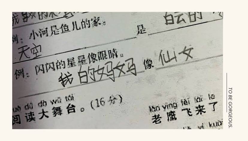 平时也会开玩笑的灌输妈妈最美,所以他总会开玩笑的叫我小姐姐。她说我是大妈吗?我开玩笑生气的说怎么可能,我明明是仙女,所以他就在卷子上写我妈妈像仙女。