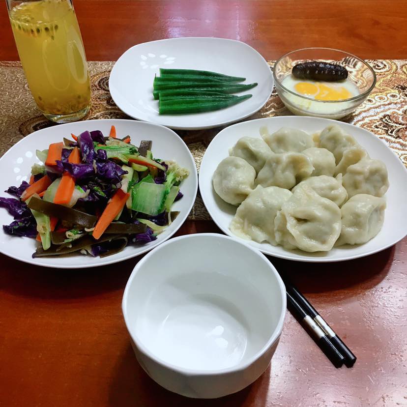 昨晚提前把面活好,把辅料都备齐啦,今天早起包饺子也很省时间。早餐:芹菜猪肉水饺/秋葵/蒸蛋/炒合菜:虾皮、紫甘蓝、海带、胡萝卜、西兰花梗、快菜/百香果水
