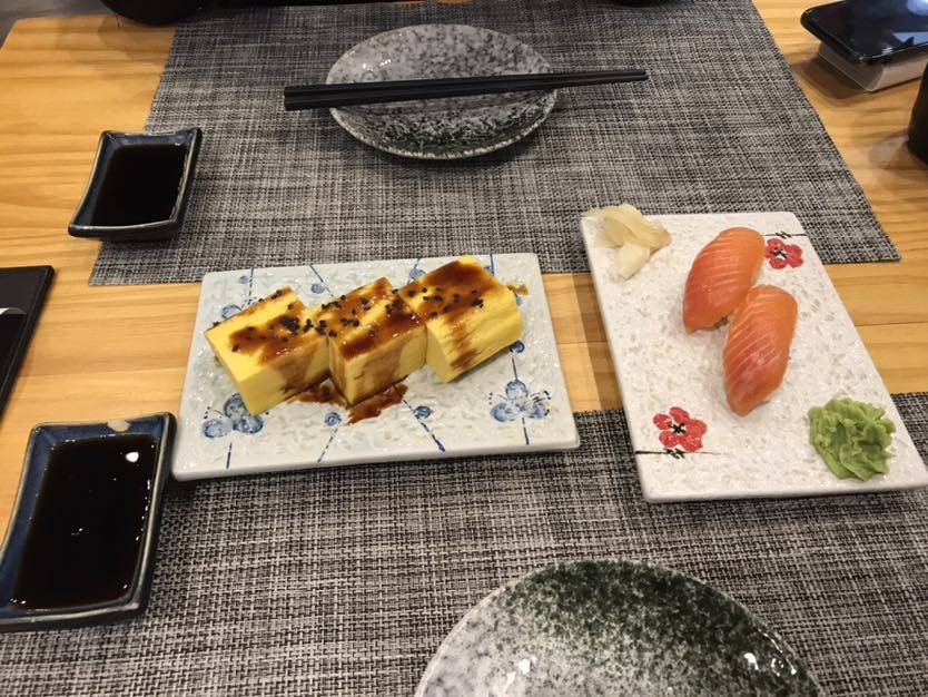 考虑到两个人都不适合大吃大喝,原定的自助餐取消了。最后去吃了日料,定食的。两个人,一份饭,一碗面,一份玉子烧,一条秋刀鱼,两个寿司,一碟豆腐,两碗汤,蔬菜沙拉。以为量少,结果还是吃到撑了。。