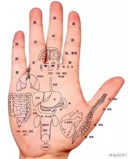 手的学问——手指按中医五行土、木、火、金、水分开:大拇指为五行土,指尖代表脾、指跟代表胃;食指为木,指尖代表肝、指跟代表胆;中指为火,指尖代表心、指跟代表小肠;无名指为金,指尖代表肺、指跟代表大肠;小指为水,指尖代表肾、指跟代表膀胱。哪儿疼就柔那里。