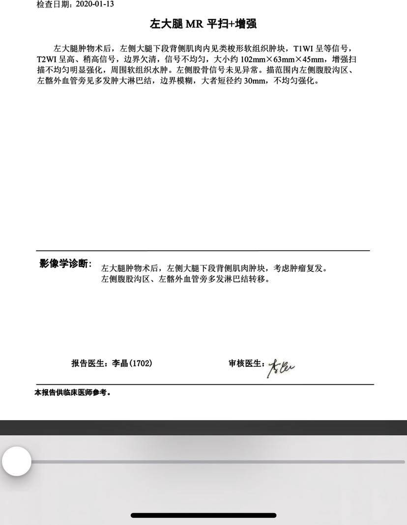 2019年6月父亲单位体检发现肺部肿瘤很大,当即回老家带他去广州,做pet-ct,免疫组化,基因分子诊断报告,才发现原来我父亲大腿的肿瘤不是肌纤维母性细胞,而是粘液纤维肉瘤。中途因为我父亲的原因耽误了时间,到12月才把结果拿到找医生定下治疗方案。