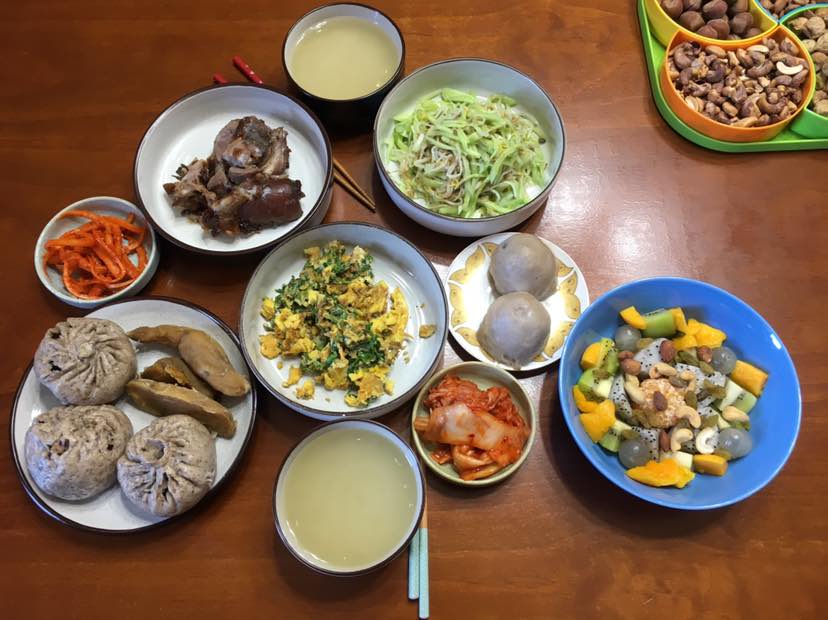 早餐:黄瓜拌豆芽/芹菜叶炒土鸡蛋/酱肘子/韩国泡菜/藜麦粥/香菇木耳🥕白菜包子、糯米红豆包和地瓜干