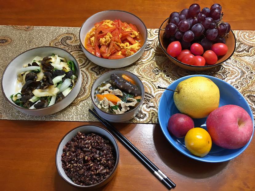 早中餐:小白菜木耳炒黄瓜/西红柿炒蛋/肉片海带🥕汤/16种杂粮饭