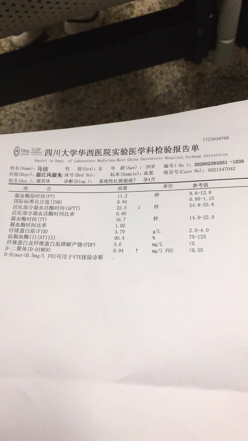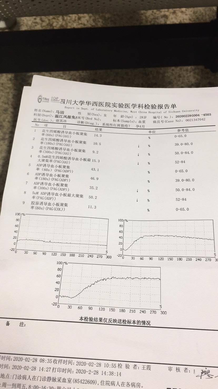 今天拿到单子血小板聚集率很低,检验科大夫特意给我打个电话问我有没有用降血小板的药我说用了阿司匹林,然后看到凝血的单子我D2聚体还高了挺多的,拿单子给大夫看大夫只看了一下说血小板聚集率低然后凝血的单子他都不看我说我D2聚体高了,他好像扫了一眼,前面他开的一部分抗体单子我去那个检验机构所在的地方检查被告知被征用新冠专区了,那个机构的人从过年就没有来上班,我跟大夫说他说那就等疫情过去再查吧,让我接着吃阿斯匹林先不打肝素吧等那些抗体结果出来再说。疫情过去都不知道什么时候呢真的好着急不知道怎么办了