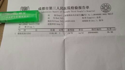 今天老爸在成都第三人民医院的肿瘤标志物CEA血清检测结果出来了,2182,我的老天,咋这么高,之前有停药4天,2015年11底华西医院检测结果是大于1000,并无具体数据,这个检测结果让老爸知道,他肯定就不再服用特罗凯,如果不在服用,这意味着我们就放弃靶向药治疗了,在这里,想请教一下有关CEA指标这方面的问题,如果上升说明特罗凯无效?