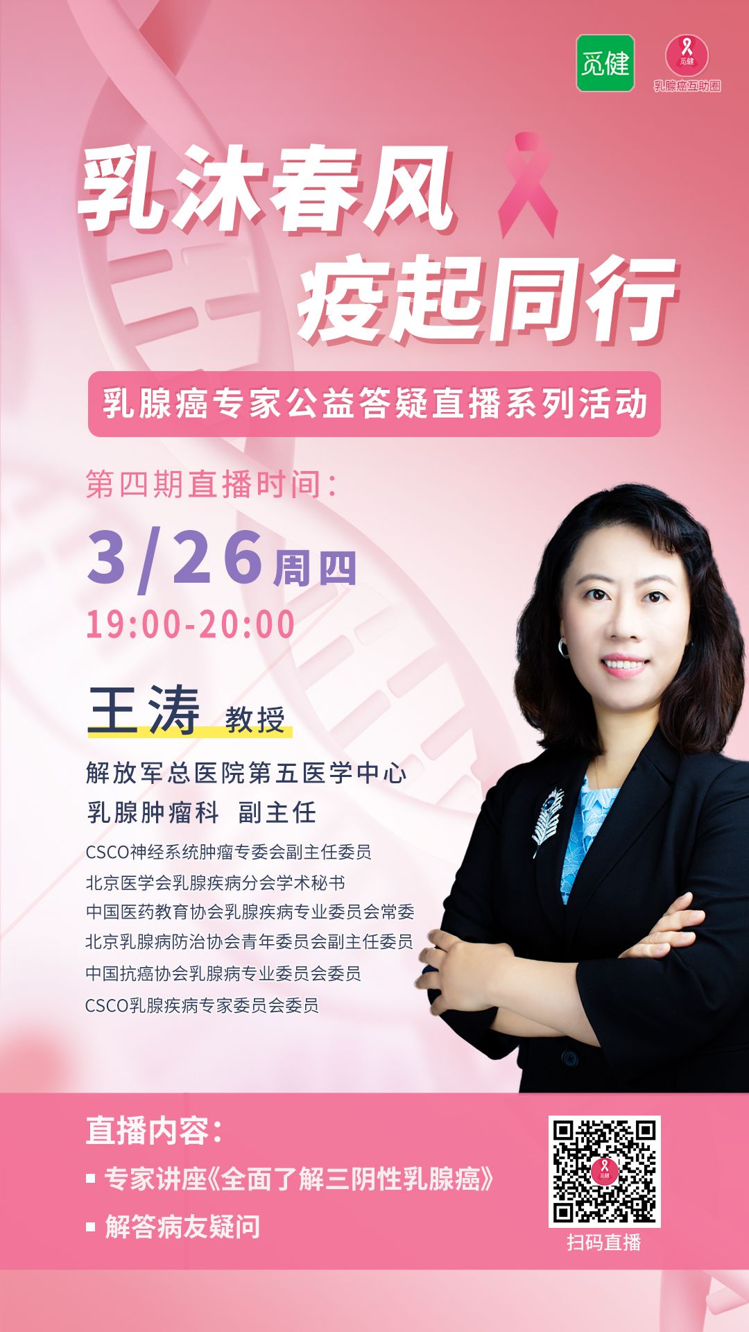 正是因为三阴乳腺癌患者常常为疾病所困扰,【乳沐春风,“疫”起同行】——乳腺癌专家公益答疑直播活动第四期邀请到解放军总医院第五医学中心乳腺肿瘤科王涛教授,为广大的觅友们带来大家最关心的《全面了解三阴性乳腺癌》专题讲座。