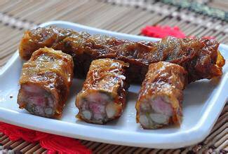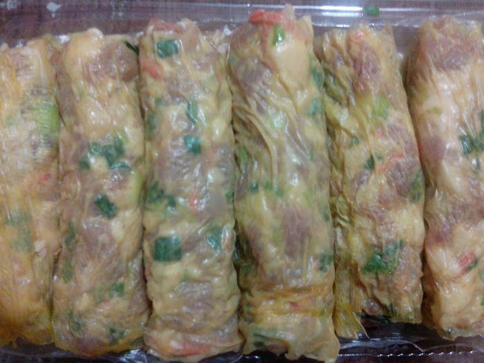 这个是闽南地区都会吃的五香条,外面是豆皮包起来的,里面是剁碎的肉,还有葱,豆腐,马蹄等,伴上面粉,五香粉,图片这个是刚包好的还没炸。