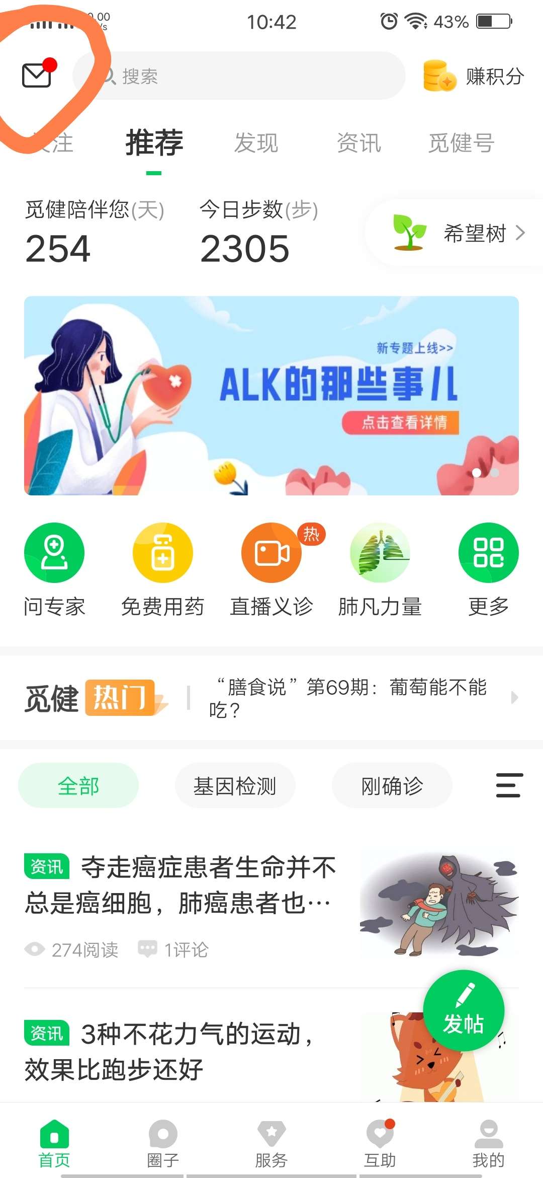 为什么我的觅健首页左上角没有信封一样的图标?哪里设置不对吗?