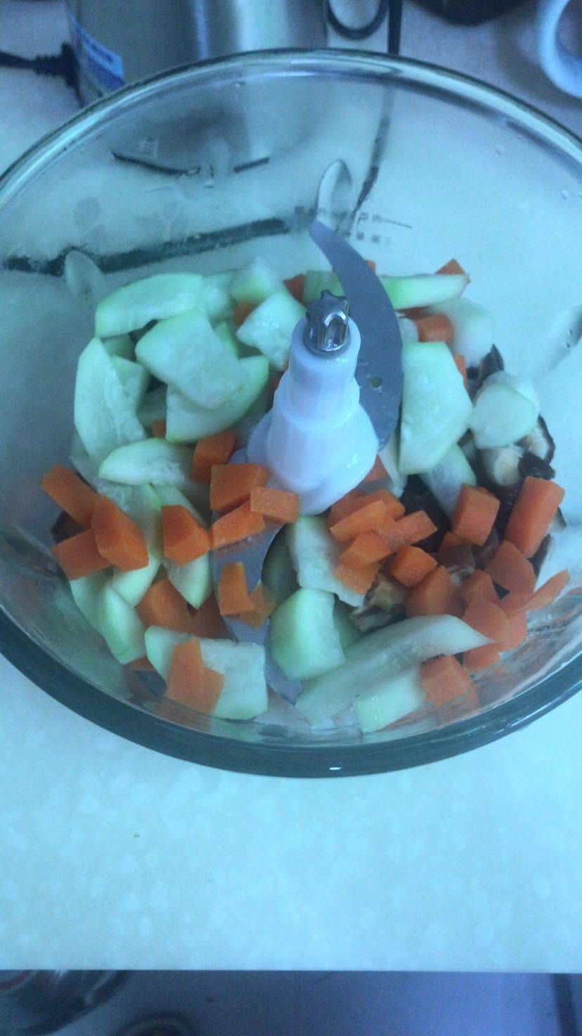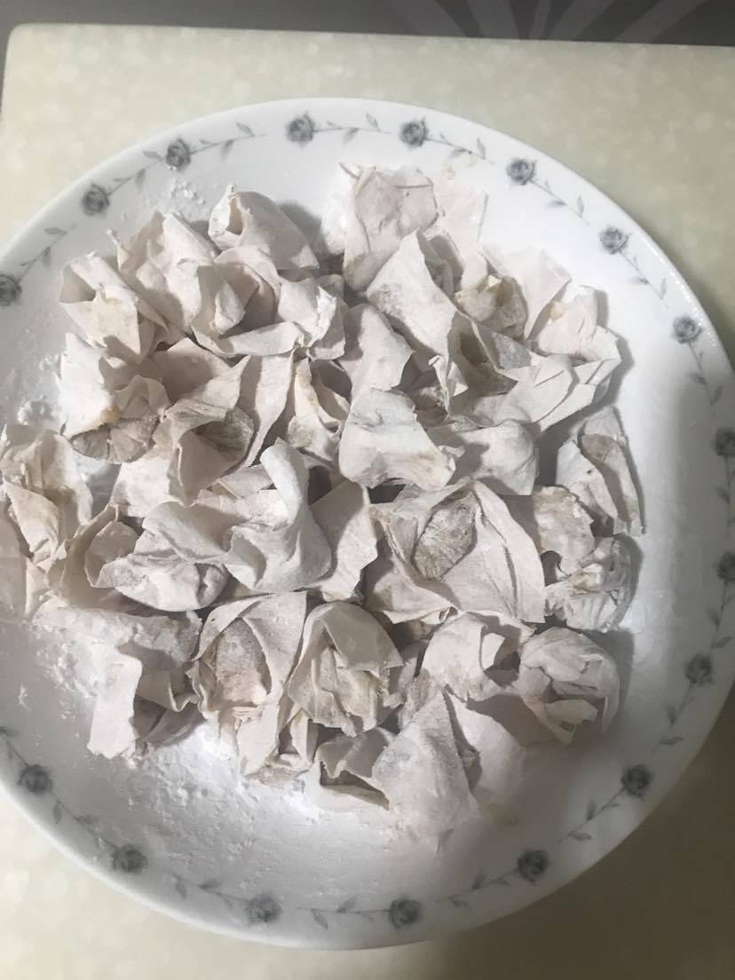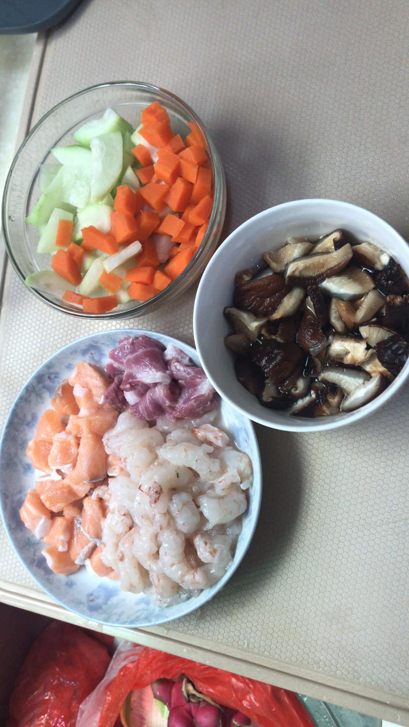 今天给宝贝孙女包了混沌;食材:新鲜虾仁150克;三文鱼50克;猪肉少许;干香菇20克;葫瓜150克;红萝卜50克;(葫瓜、红萝卜搅拌后最好挤出水分)切成小块,放入搅拌机,30秒完成,加入蚝油,蒸鱼汁,熬好的猪油少许,加点葱花,一点味精,加点土豆淀粉,街上买回猪肉手工燕皮,耗时3小时的手工混沌(包了3份一)实在太费心神了,累!