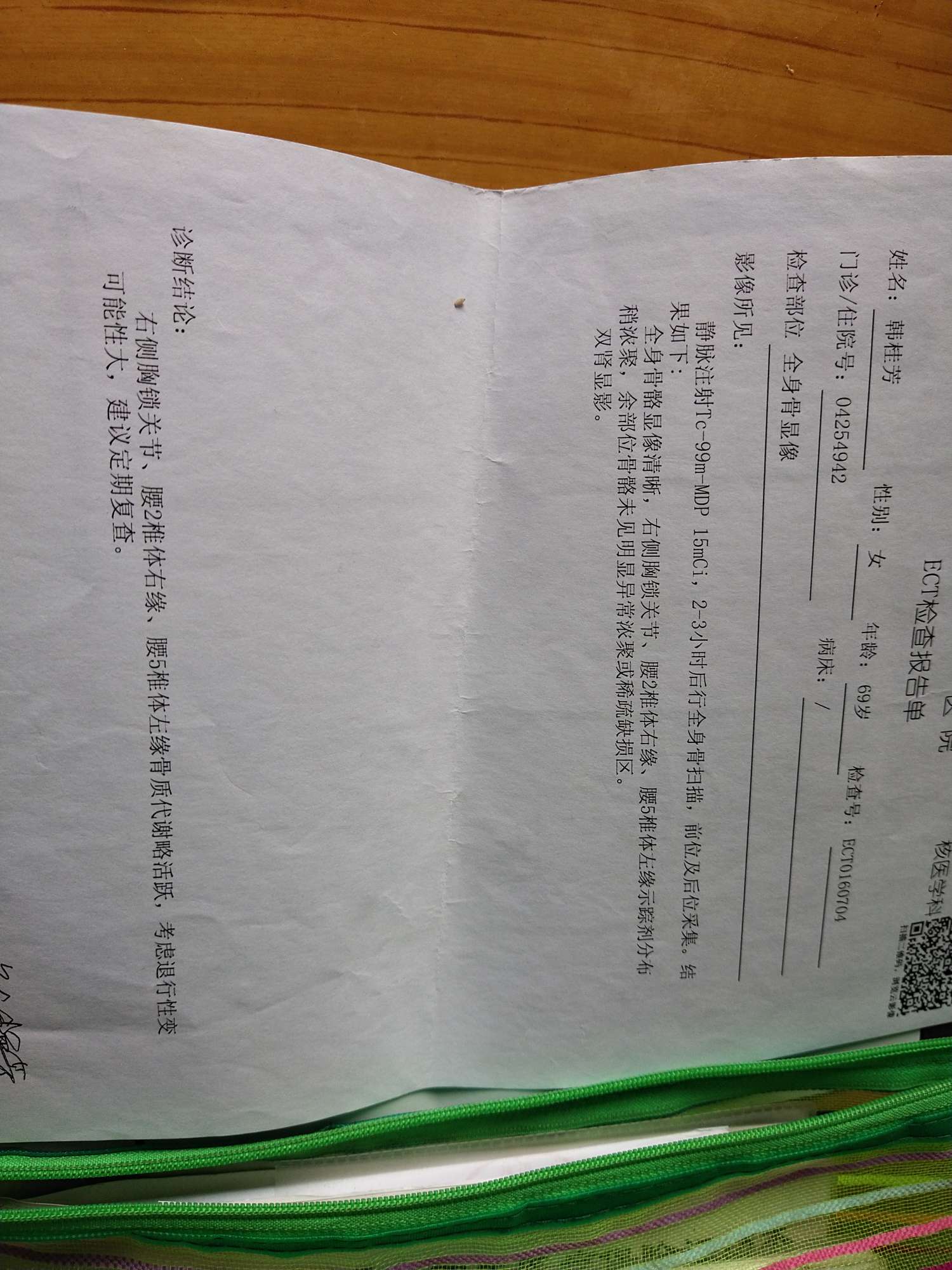 我手术一年做的骨扫描结果。一位医生让我再做磁共振,另一位医生建议随访。我因为乳腺做B超钼靶和磁共振分类都不同,从没有一一4C一一2,医生一定要确诊再解决问题,这骨扫描问题等半年后再复查。作参考。