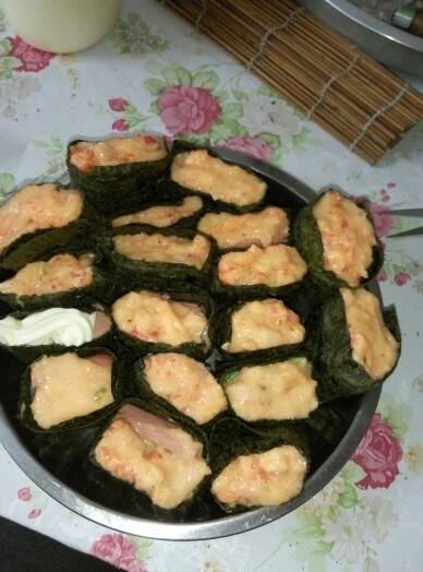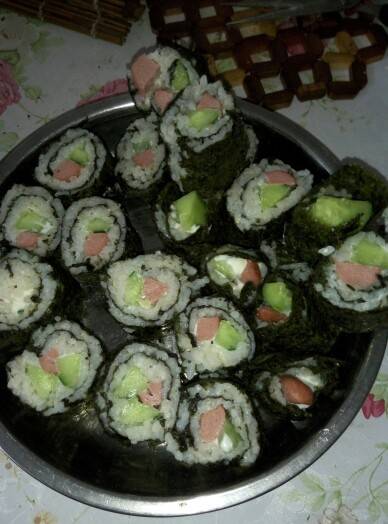 然后准备好了,就开始,带手套,拿卷帘,放一片紫菜,铺饭,薄薄一层,压6一压,在面前的一端放上食材(青瓜,香肠,沙拉酱)定好位置,就卷起来,记得压紧,这样就会松浮浮的感觉。然后拿刀切成一一块块,大功告成。这个是卷的做法,