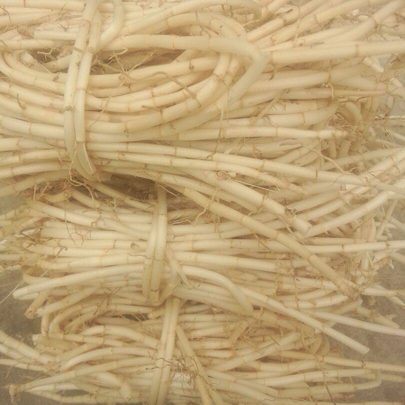 性状:本品呈长圆柱形,长30~60cm,直径0.2~0.4cm。表面黄白色或淡黄色,微有光泽,具纵皱纹,节明显,稍突起,节间长短不等,通常长1.5~3cm。体轻,质略脆,断面皮部白色,多有,裂隙,放射状排列,中柱淡黄色,易与皮部剥离。无臭,味微甜。