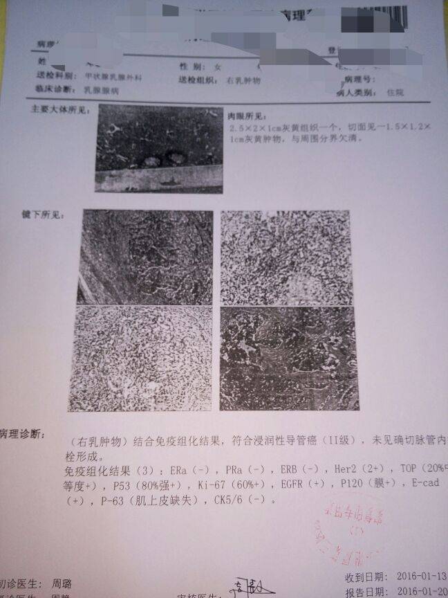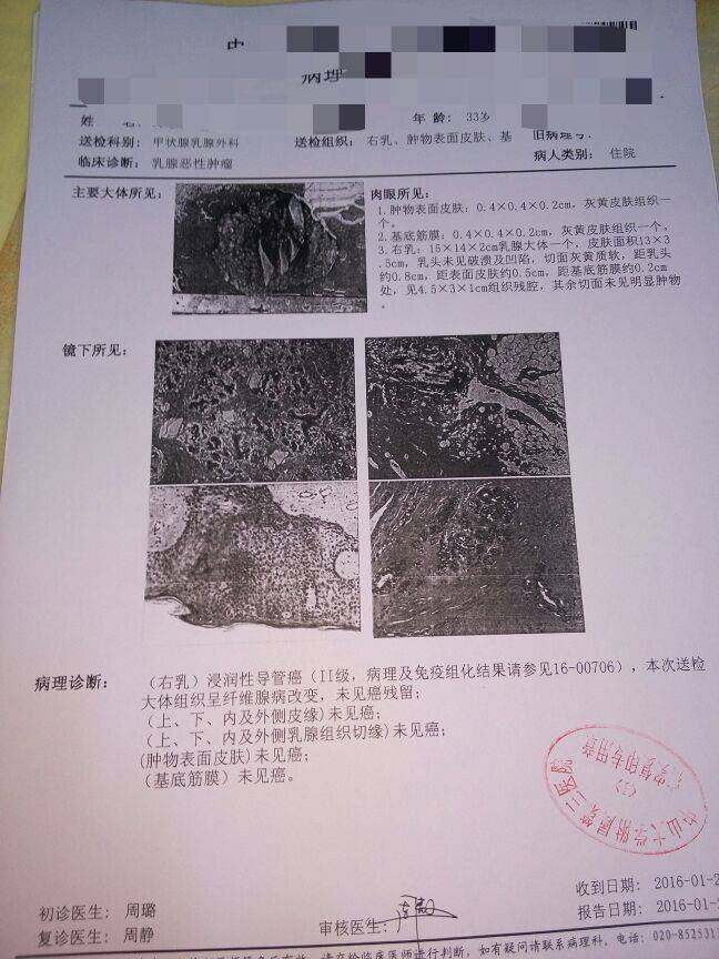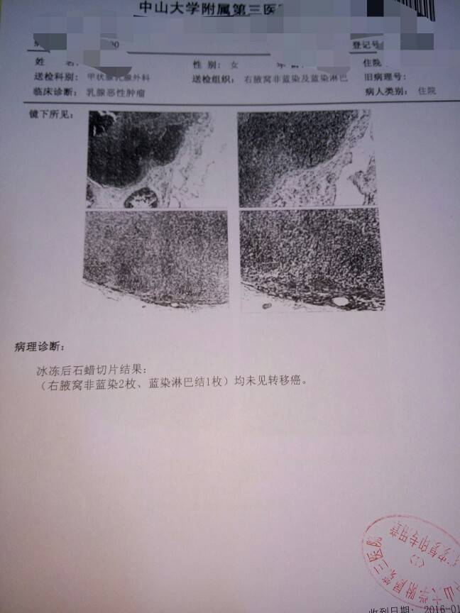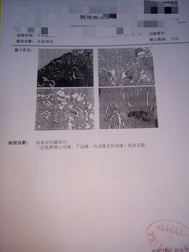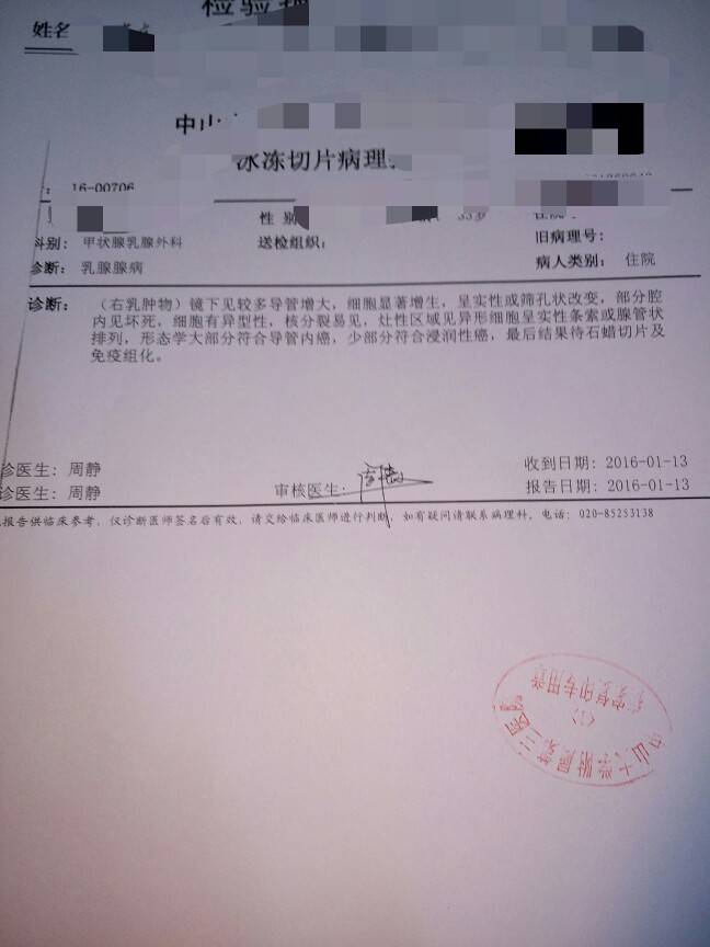 2016年1月13日局麻切除肿物,30分钟快速冰冻切片结果显示肿物四周没有癌细胞,但肿物内部有癌细胞…