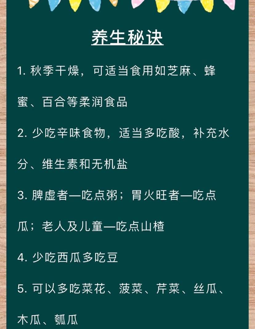 立秋后后应少吃辛味食物,辛味通肺,助长肺气,若摄入过多,易造成肺气太盛,出现上火、便秘等秋燥症状。适当多吃酸,可收敛肺气、防秋燥。适当补充水分、维生素和无机盐。