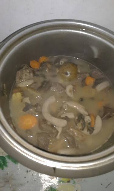煲了一个多钟,保暖,小火煲着,到了快吃饭,在加火,到吃饭,浓缩型的汤啊!好香,好甜,味道很好,全部喝完,渣都吃完😄😄然后蒸了3种鱼干,还有一条新鲜鱼爸爸吃,抄了个白菜。o啦