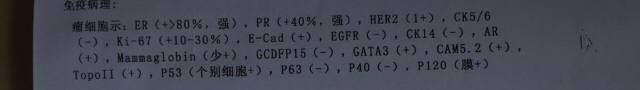 右乳切除手术加腋下淋巴前哨,术后病理:1.3*1.3*0.8cm,浸润型导管癌,三级,内下象限:局灶导管上皮不典型增生,ER( >80%强)PR( >40%,强)HER2(1 )CX5/6(-)Ki-67( 10-30%)fish检测阴性。腋下淋巴无转移。行CEF*3-T*3化疗方案