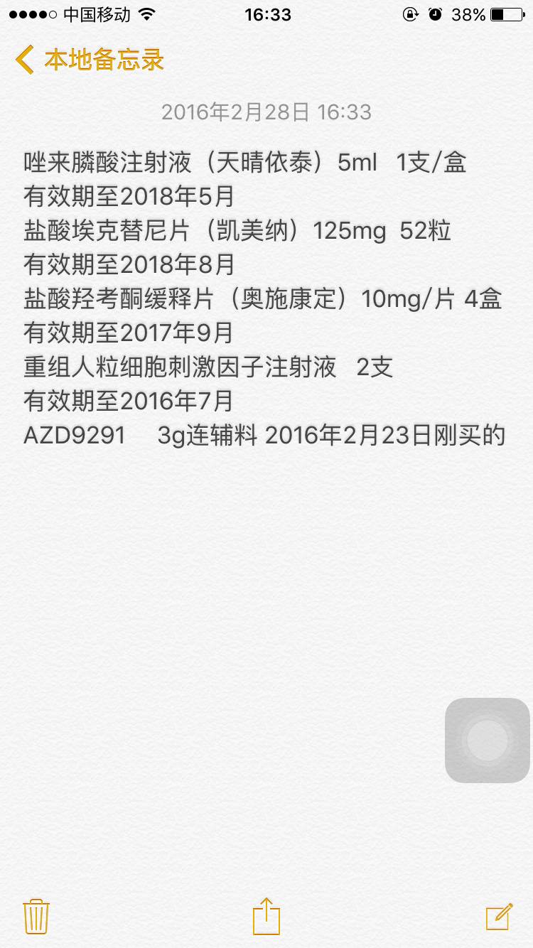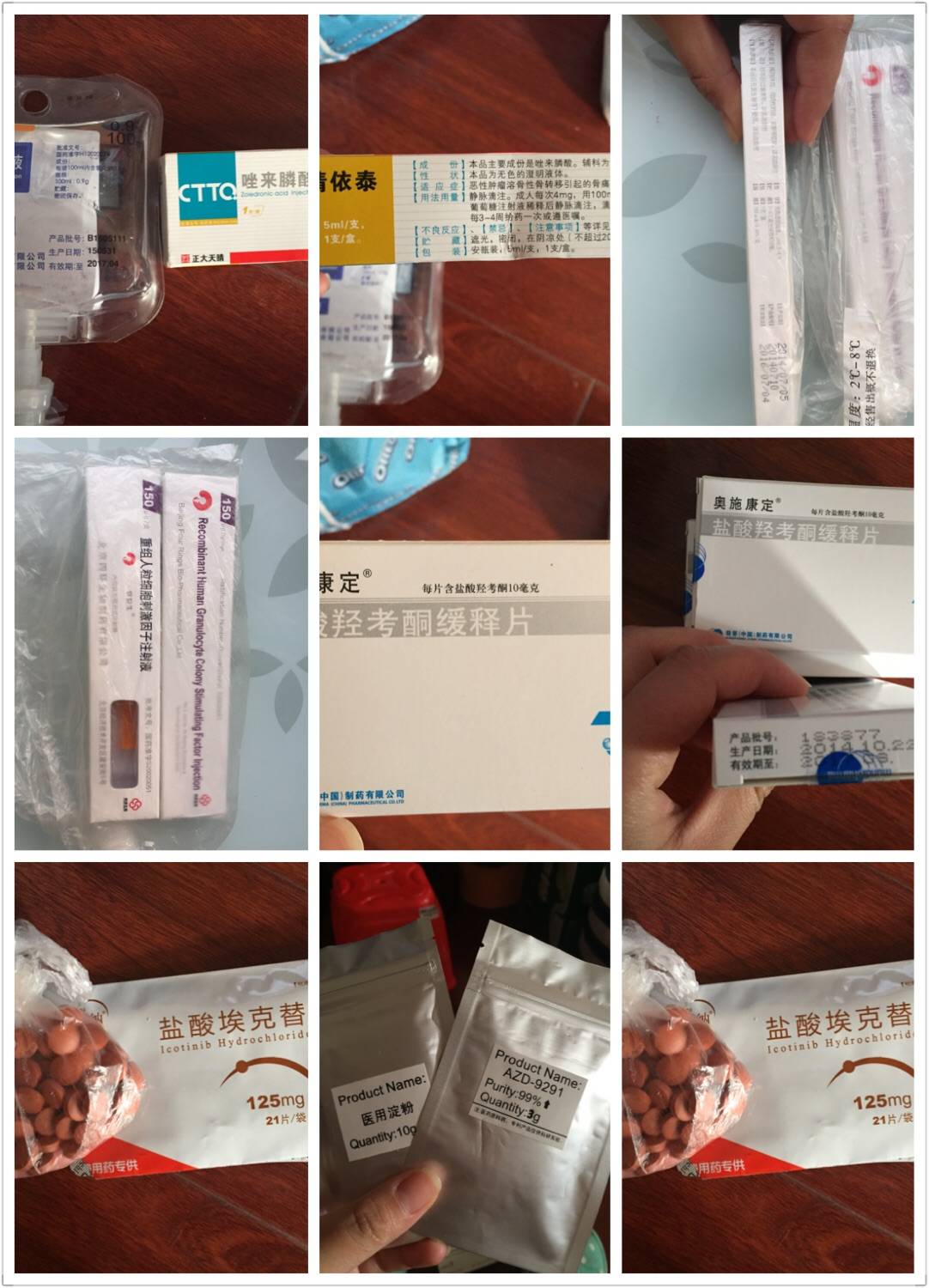 另外,母亲在病逝前在医院住了81天,多下来一些药,比如9291( 3g,未拆封,收到当天母亲就走了),唑来膦酸(1盒,准备开了出院备用的),羟考酮(4盒,类似于吗啡的止痛片,母亲看到吗啡之类的字眼会乱想病情,所以去医院疼痛科开的羟考酮,副作用比吗啡小,镇痛效果比吗啡好)升白细胞的针(2支,也是开了出院备用的),还有散装凯美纳(因为母亲记性不好,老是忘了吃药,所以药被我拆开来放在药盒里让她吃的,共52粒),我打算便宜转给有需要的病友,半卖半送,有需要的病友私信我!