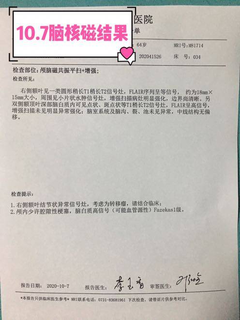 克四个月确实有点短,而且原发效果那么明显,刚开始确定没有脑转?确定是脑转新发?