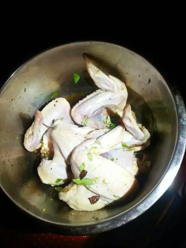 材料:鸡翅,柠檬叶,蒜头,酱油。把柠檬叶,蒜头,剁碎,拿个碗,加点油,加点酱油,盐少许,丁点砂糖,搅混,在倒入鸡翅里,搅拌至鸡翅完全染有颜色和香味,静放一下午,调味要适中,如果过重了,就不要腌制时间太长,这个自己控制时间啦。