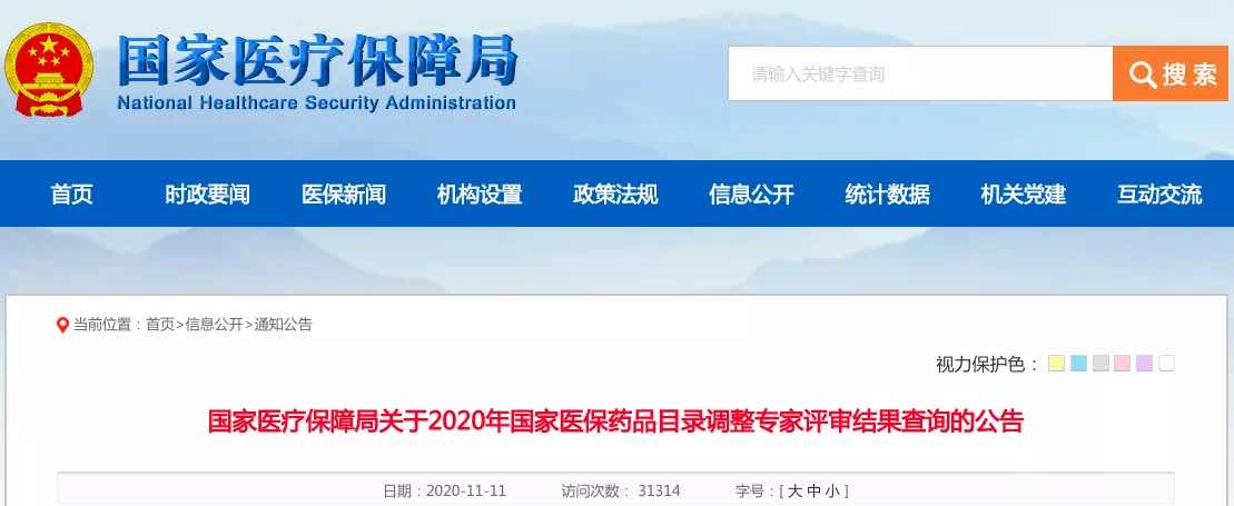 11月11日,国家医保局发布《关于2020年国家医保药品目录调整专家评审结果查询的公告》。