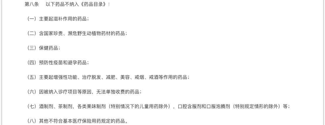 根据《办法》第八条规定,主要起滋补作用的药品、保健药品等8大类别的药品不纳入医保目录: