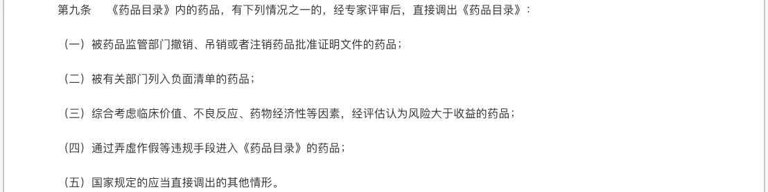《办法》第九条规定,有以下情况的药品,直接调出医保目录: