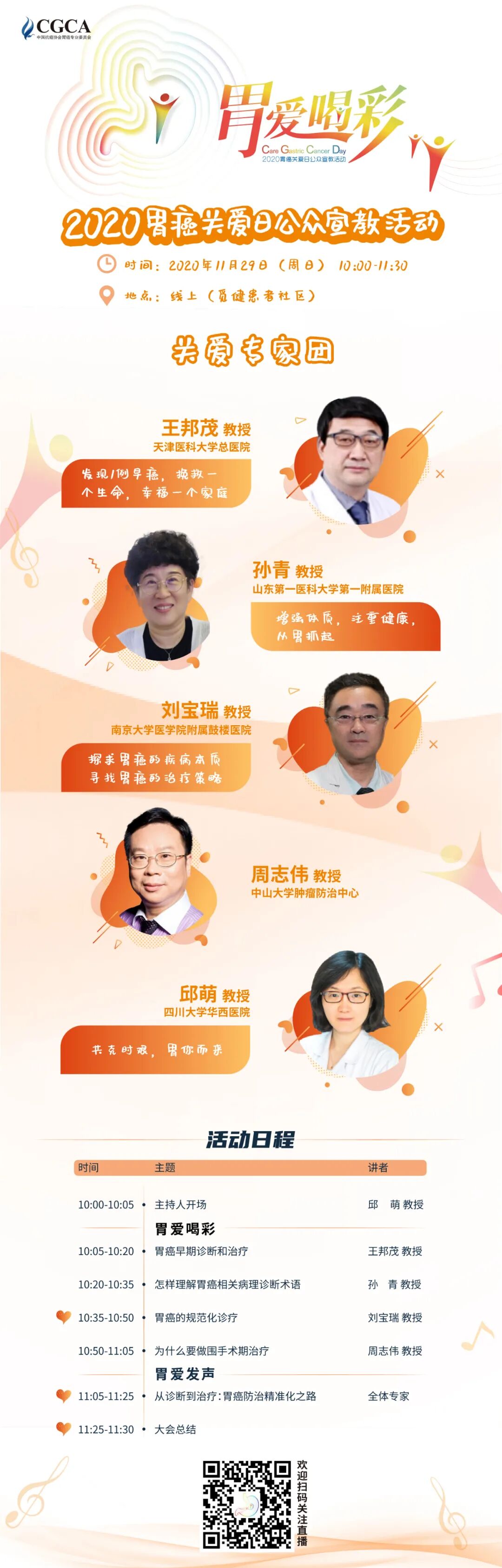 本次直播,我们邀请到了天津医科大学总医院王邦茂教授、山东第一医科大学第一附属医院孙青教授、南京大学医学院附属鼓楼医院刘宝瑞教授、中山大学肿瘤防治中心周志伟教授以及四川大学华西医院邱萌教授为广大胃癌患者们讲解胃癌的诊断与治疗问题,同时呼吁社会关注胃癌,做到早预防早筛查。