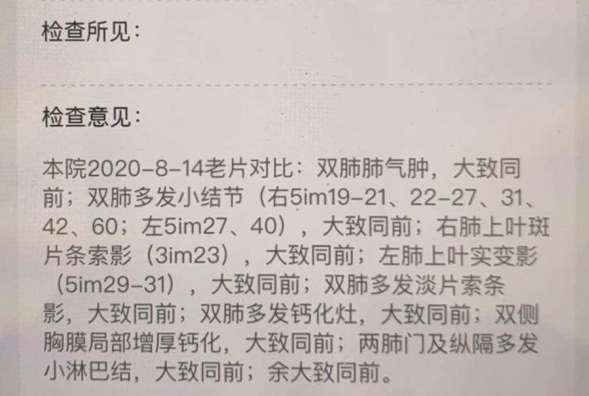 基本正常,CT显示大致同前(8月、10月都有CT,不知为啥与8月份的对比),左肺上叶占位(2月份最初6厘米多)已经多次报告为实变影。