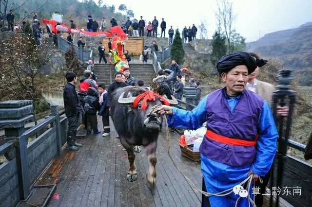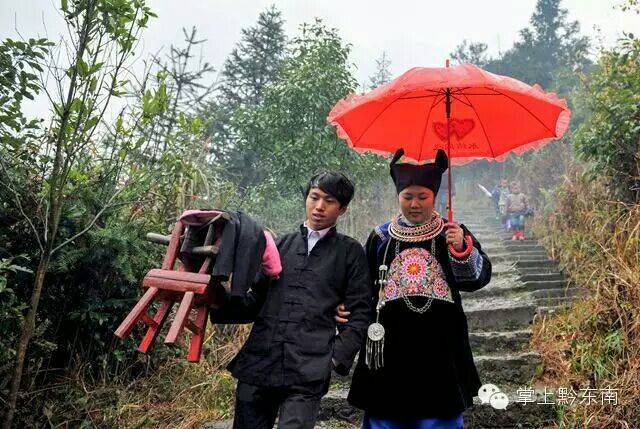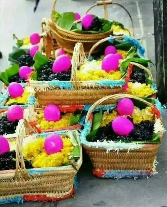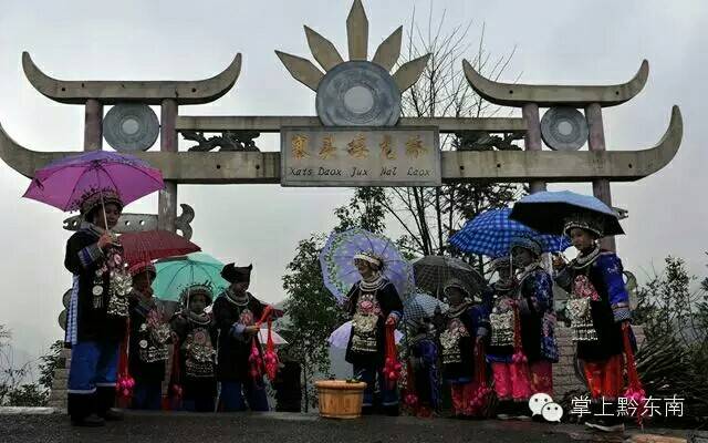 万小永接龙桥入口的牌坊下。穿着节日盛装的苗族姑娘排着队,手拿红蛋迎接客人