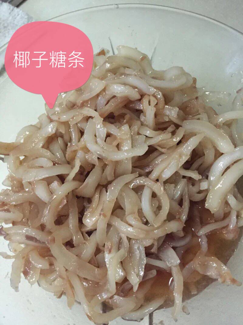 说说“椰子糖条”做法吧,其实很简单,就是椰子切条后,放椰子水和椰子条一起煮,煮到水快干时椰子也软了后,捞出椰子,然后放白糖进锅煮(至于放多少糖,看自己喜欢多甜而定),煮至白糖溶化成黏稠状,再将椰子倒入,搅拌均匀后就完成了。对于老爸自创的反沙系列,做法我不会,不过应该也就是椰子煮软后再煮糖,至于怎么做成反沙糖我就不会了
