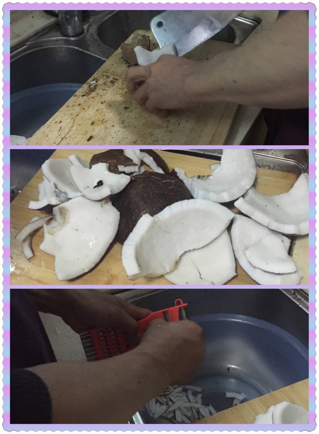 最近还自创了“反沙椰子丝”,就像超市里卖的一包包的椰丝,不过是原汁原味的,味道真的好极了。