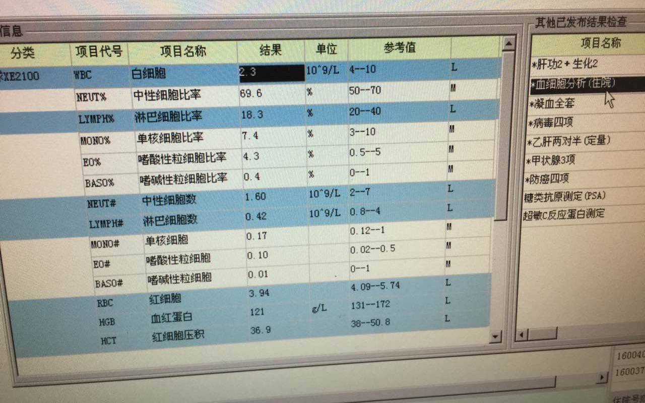 你这个白细胞和血小板低!多喝牛尾骨汤加蚕蛹!或者红豆加薏米煮水