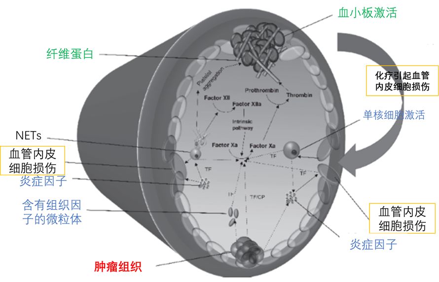 首先,恶性肿瘤组织会释放各类促凝因子,同时通过引发机体的炎症反应导致血管内皮细胞激活和血小板活化,后者会使患者的血液处于一种超凝状态,血液流速减慢,特别容易导致血栓形成。