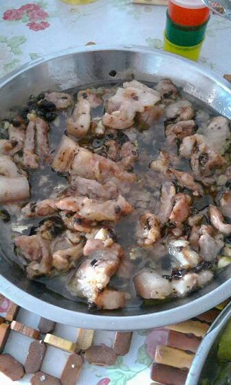 哪个肉是五花肉,切片,剁蒜头,豆鼓,加点淀粉,盐,糖,伴一下,水开了,放下去蒸,就可以啦,水开后蒸的时间15分钟左右,差不多拉,然后拿筷子伴一下,就很均匀的味道哦。下饭也是一流的,胃口一般的你,试试吧😝