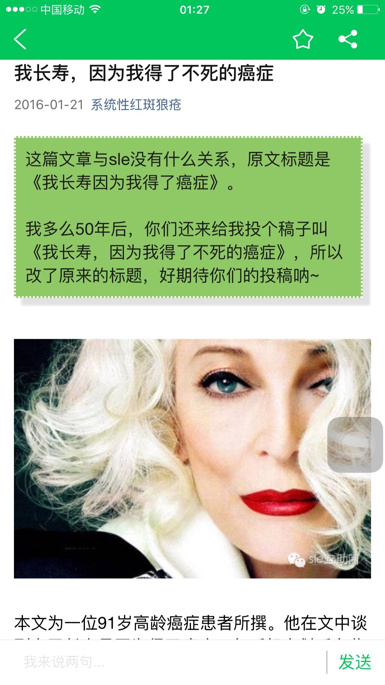 看看这篇文章《我长寿,因为我得了不死的癌症》,91岁老翁撰稿