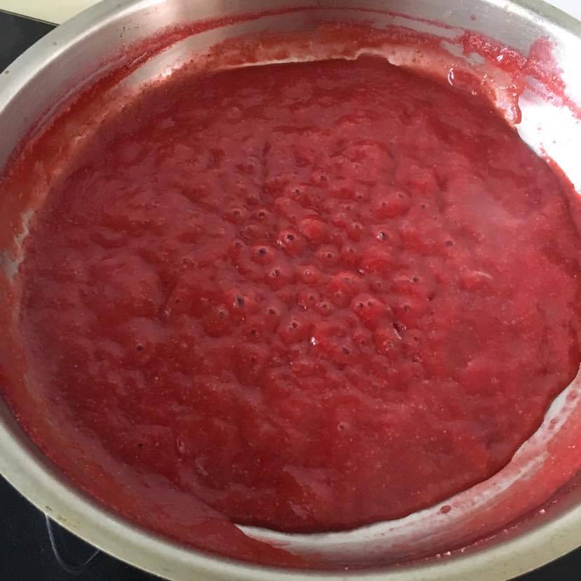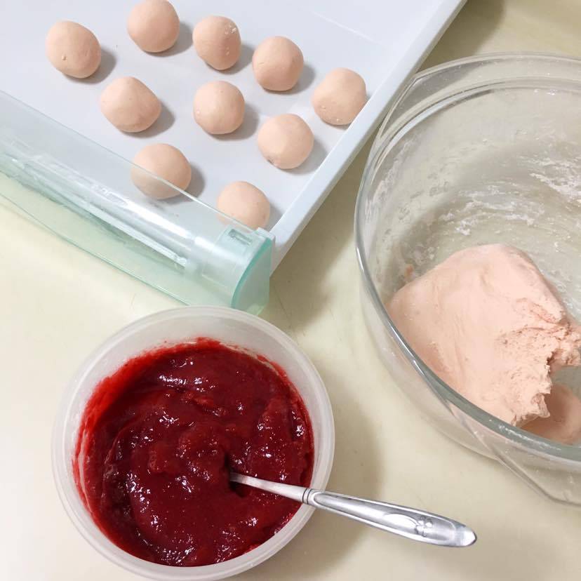 草莓馅,把草莓洗干净用料理机打成泥,过滤一下,过滤后的汁活糯米粉。