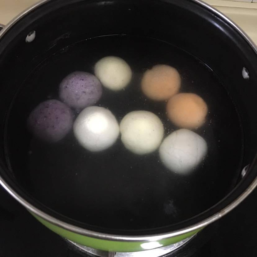 活好糯米团子后,拿出三分之一用水煮熟,然后捞出后再和剩余的三分之二一起柔成团,这样糯米粉有韧性。