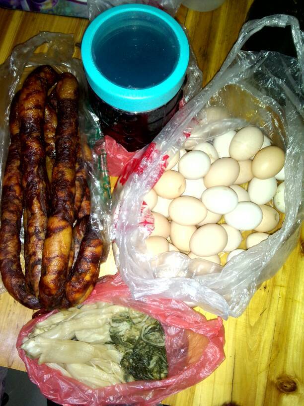 老公去他朋友那(常德),去了八天,他不在的这八个晚上,我都没过好觉,今天他终于回来了。他朋友给他带回了自家做的红酒、酸菜、腊肠、还有自养的鸡蛋,好开心,又有得吃了