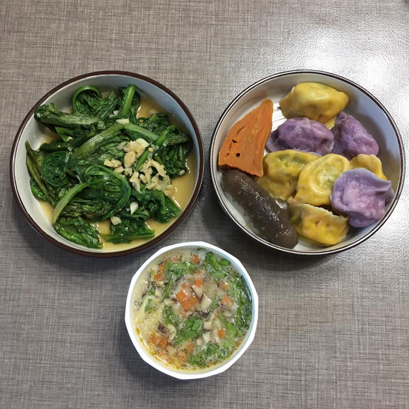 今日早餐:蒜蓉油麦菜,山药香菇胡萝卜🥕生菜鸡蛋汤,地瓜干🍠还有两种不同馅料的饺子,饺子是自己包好冻在冰箱里的。