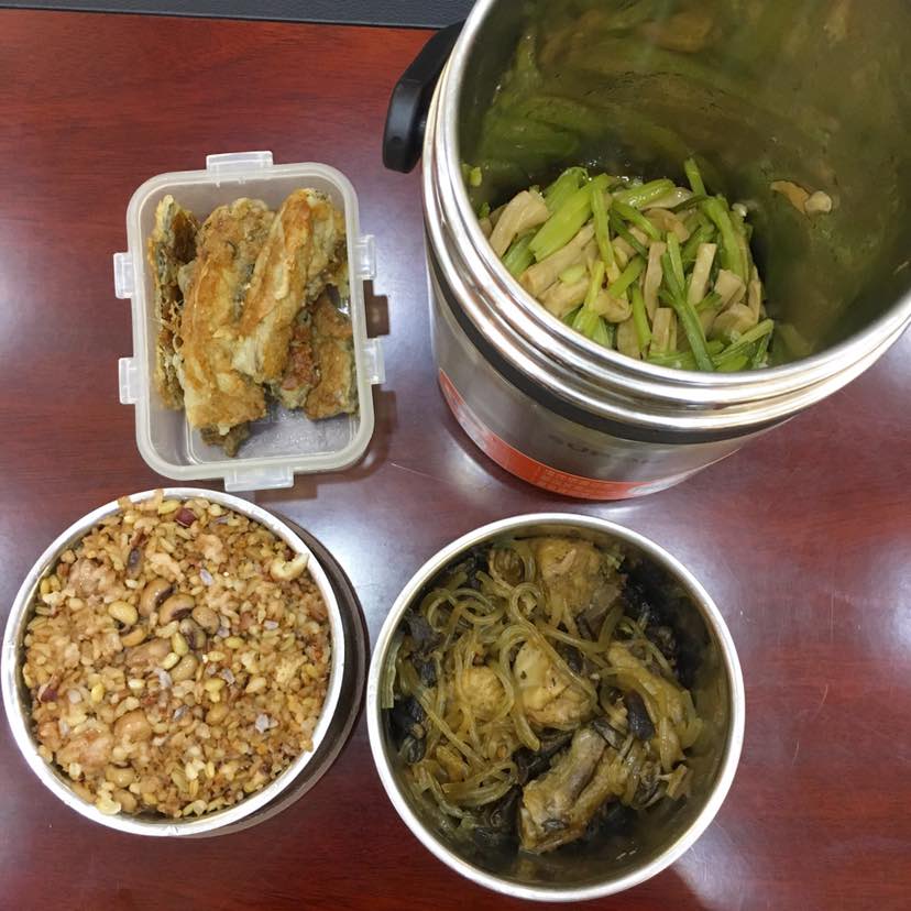 午餐自己带饭。主食杂粮饭,煎带鱼,干煸杏鲍菇炒香芹,小笨鸡炖蘑菇和薯粉。小鸡炖蘑菇做好后冷冻分份储存。早上加了点薯粉,方便快捷。