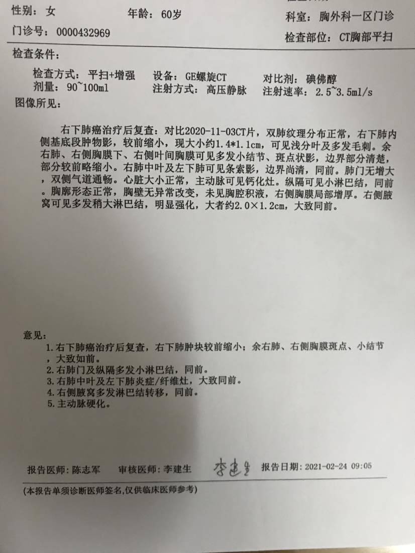 很久没发帖了,目前阿法替尼联合贝伐治疗,第二次复查,体感正常,CEA: 3.14,CT报告如下图。
