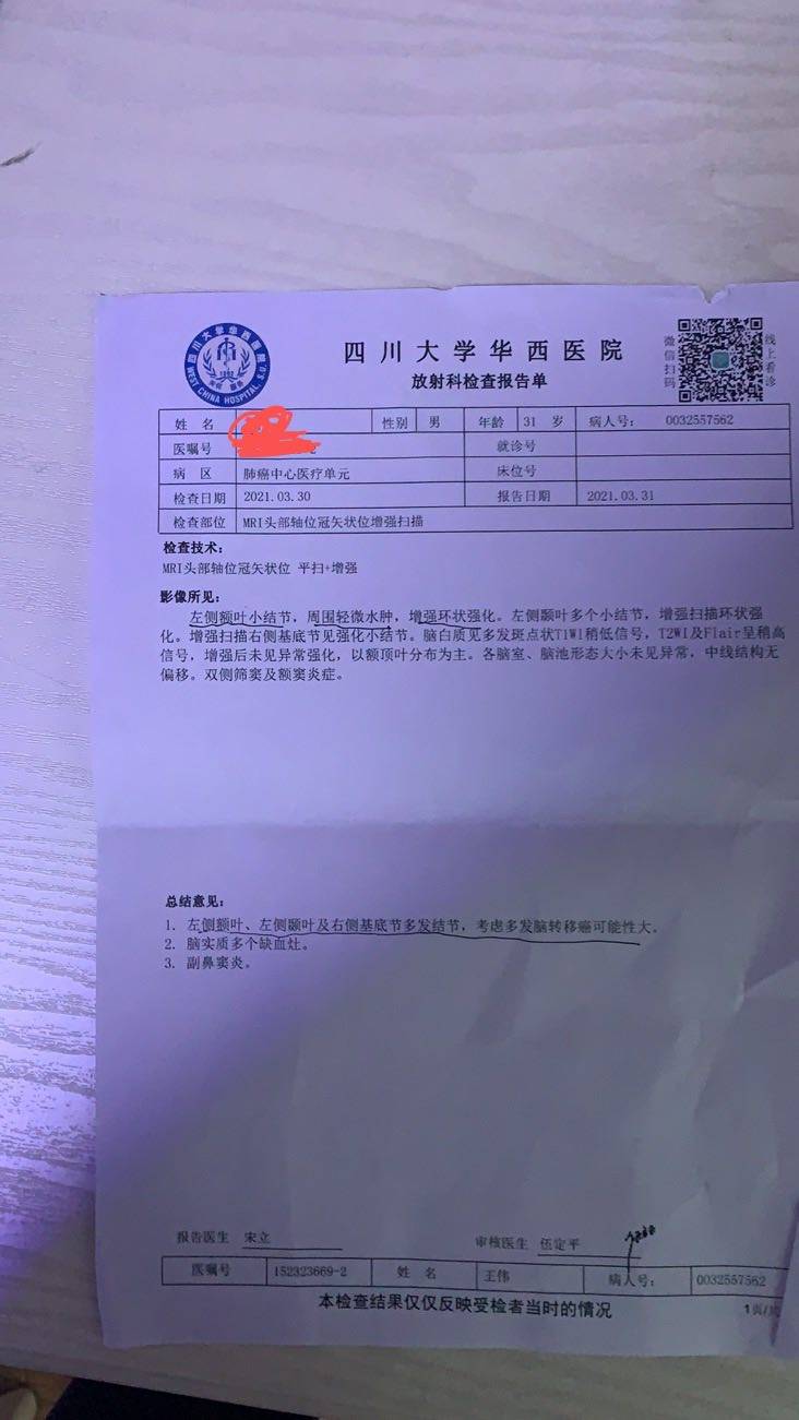 本人2019年6确诊左肺上叶伴纵隔淋巴结转移,检查之初不能手术,alk融合基因突变,直接吃的单药克挫替尼,然后于2020年3月在华西做的开胸降期手术,术后继续吃单药克挫替尼到2021年3月份,现在发现脑部多发转移,以及胸部有所进展,请问哈朋友现在怎么办?下面是最近的体检报告!