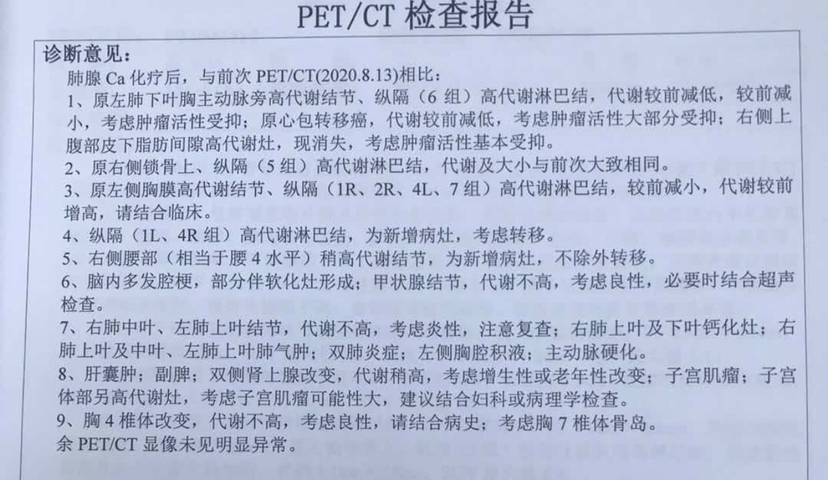 回首这一路治疗,从最开始充满希望期待能CR,到出现脑转后渐渐面对现实。我真的已经尽全力了。现在明白了还是要面对现实,对这个病有正确的期望值,但是有时仍然接受不了。在这里特别感谢陈波医生指导,感谢觅友们的帮忙,尤其感谢阿弗乐,每次热心回答我的问题,消除我的疑虑。也是看到她说要检查脑核磁,我才跟主治提出。这次PET CT也是我跟主治提的。我把片子给网上影像科医生评估后觉得有进展,于是我决定做PET CT。我也理解主治的方案,我咨询了很多医生,方案也都一样,毕竟肺CT显示稳定,原发灶也一直不报,淋巴结用免疫的话确实也不好评估。而且一种药要用到极致,因为没有多少选择了。但是不管多信任主治,也一定要自己留心,有疑虑不要迟疑。