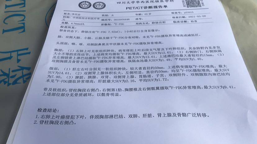 妈妈患肺癌已经有三年了,这三年来一直在接受治疗到现在,下面是妈妈检查以及治疗的过程。2010年10月,妈妈体检出肺癌IV期,纵隔淋巴转移,肝部转移,去省肿瘤医院复查,做了PET-CT,结果一样,省肿瘤