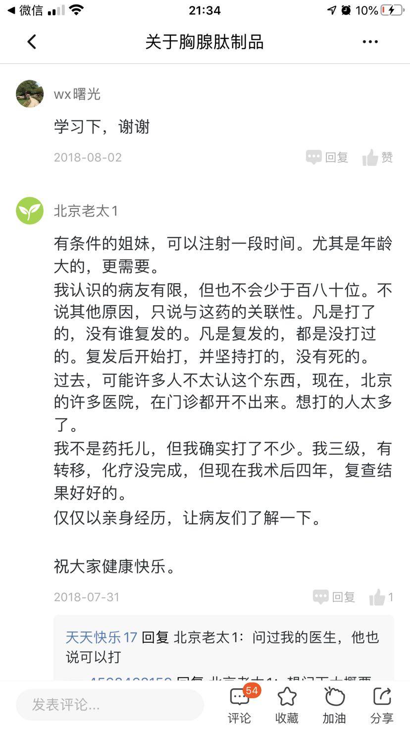 我和北京老太通过电话,她人特别好,我也关注了她所有文章。所以这个胸腺肽可以早点打上。我也计划7月复查后去打
