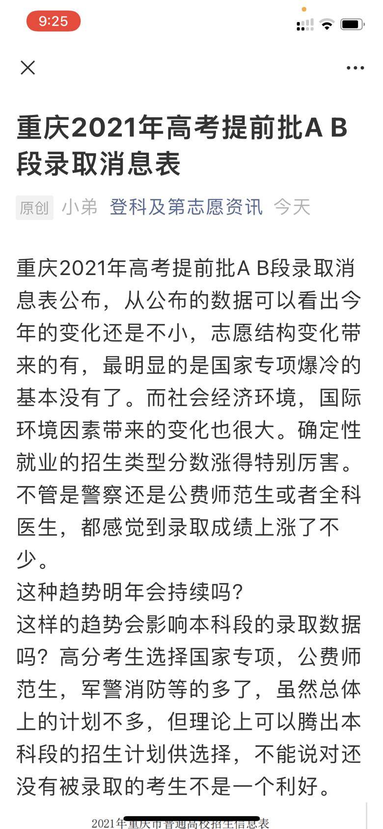 前段时间看各省的录取信息,哪哪儿都在晒录取通知书,重庆录取安排分外的晚,只能忐忑不安的等待。提前批A端是艺考和军警校等,和我们无关。